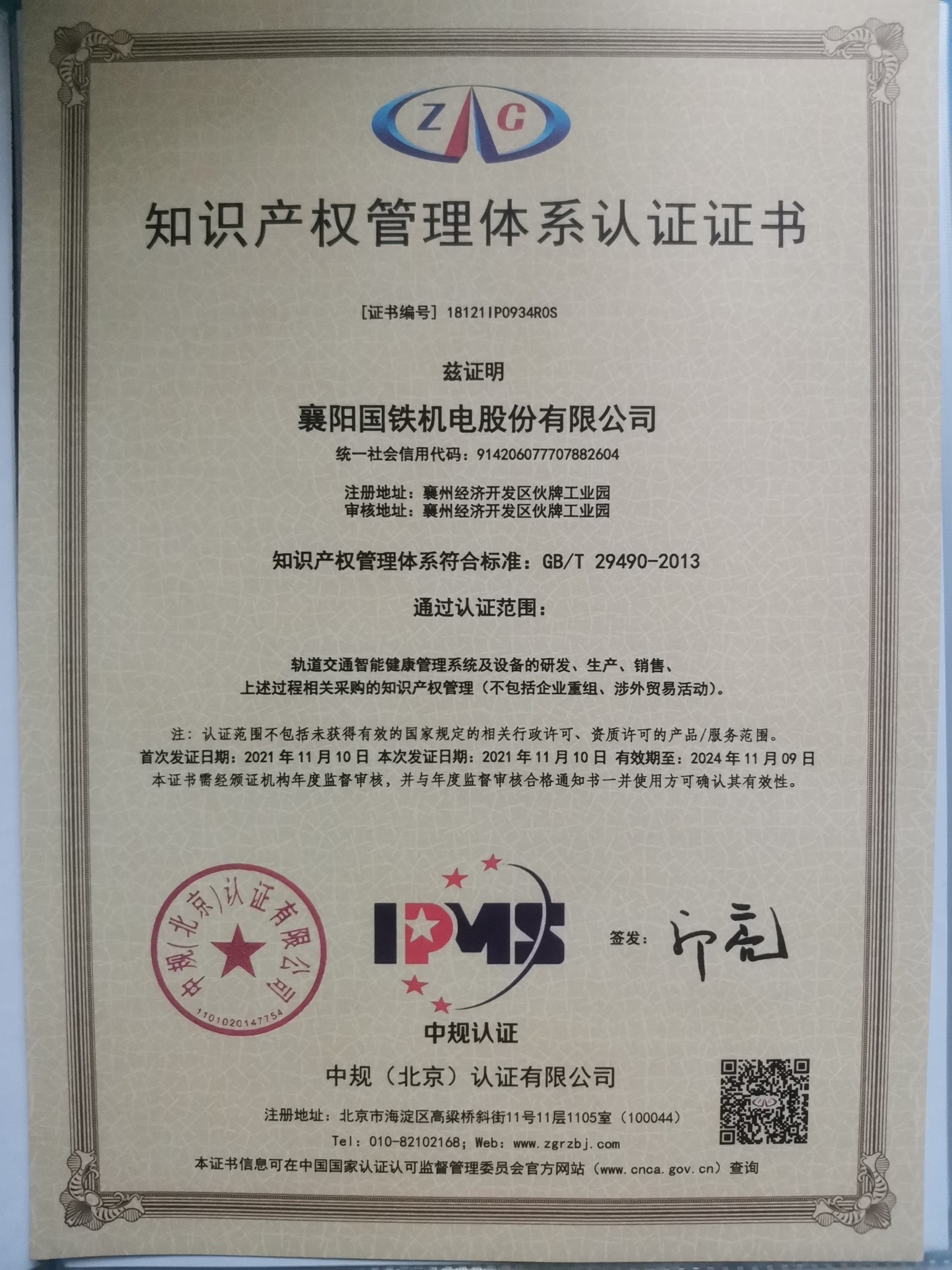 知識產(chǎn)權(quán)管理體系認證證書