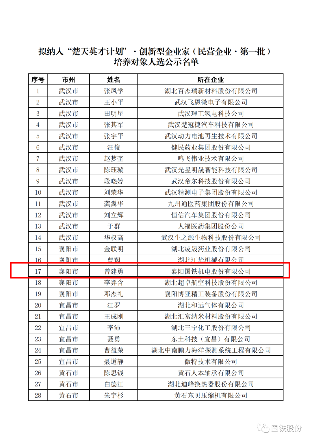 喜報!國鐵機(jī)電董事長曾建勇入選“楚天英才計劃”·創(chuàng)新型企業(yè)家培養(yǎng)對象
